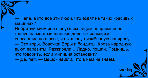 — Это воры, Вовочка! Воры и бандиты. Кровь народную пьют, паразиты. Разжирели… Ладно, пошли. Помнишь, что говорить, если милиция остановит?