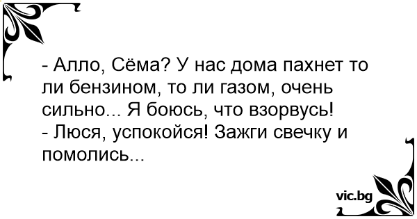 - Алло, Сёма? У нас дома пахнет то ли бензином, то ли газом, очень сильно... Я боюсь, что взорвусь!