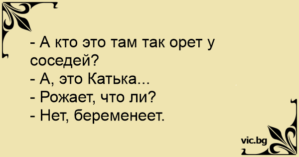 — Хто там так кричить у сусідів? — Та це ж Катря! — Народжує, чи що? — Та ні — вагітніє.