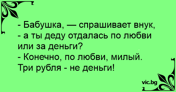 - Бабушка, — спрашивает внук, - а ты деду отдалась по любви или за деньги?