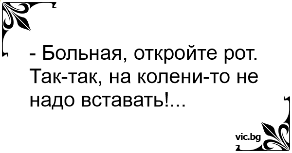 Блондинка е при зъболекаря. Зъболекарят стои с гръб и търси нужните инструменти, и я моли да отвори устата. Обръща се към нея и казва: