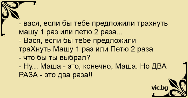 - Вася, если бы тебе предложили тpaXнуть Машу 1 раз или Петю 2 раза