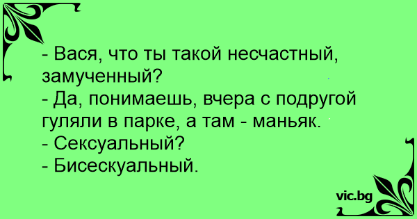 - Да, понимаешь, вчера с подругой гуляли в парке, а там - маньяк.