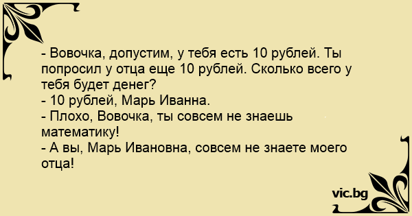 - Вовочка, допустим, у тебя есть 10 рублей. Ты попросил у отца еще 10 рублей. Сколько всего у тебя будет денег?