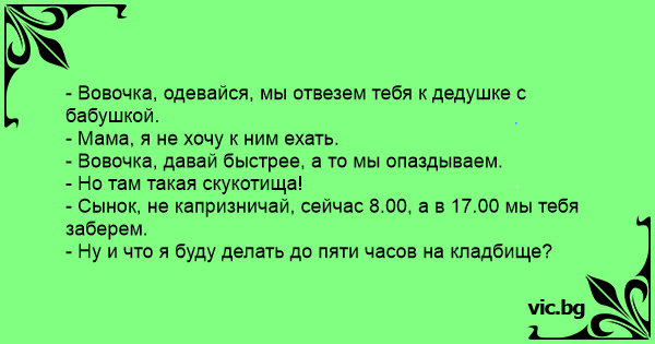 - Вовочка, одевайся, мы отвезем тебя к дедушке с бабушкой. - Мама, я не хочу к ним ехать. - Вовочка, давай быстрее, а то мы опаздываем. - Но там такая скукотища! - Сынок, не капризничай, сейчас 8.00, а в 17.00 мы тебя заберем. - Ну и что я буду делать до пяти часов на кладбище?
