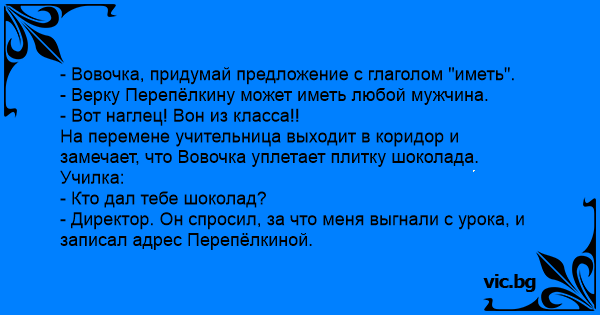 На перемене учительница выходит в коридор и замечает, что Вовочка уплетает плитку шоколада. Училка: