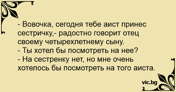 - Вовочка, сегодня тебе аист принес сестричку,- радостно говорит отец своему четырехлетнему сыну.