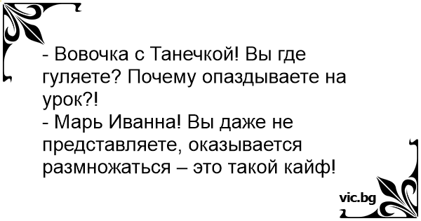 - Вовочка с Танечкой! Вы где гуляете? Почему опаздываете на урок?!<br />- Марь Иванна! Вы даже не представляете, оказывается размножаться – это такой кайф!