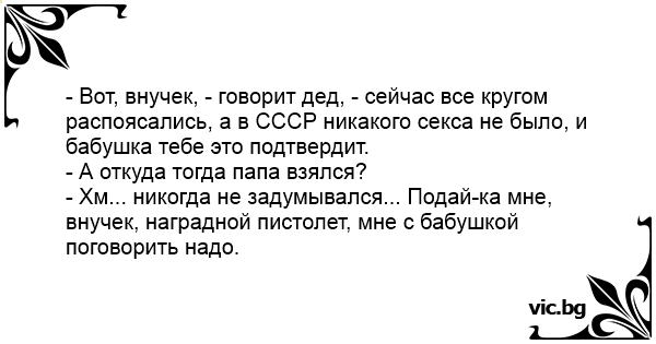 - Вот, внучек, - говорит дед, - сейчас все кругом распоясались, а в СССР никакого cekca не было, и бабушка тебе это подтвердит.