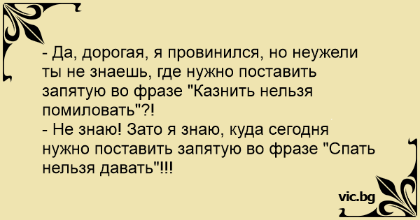 - Да, дорогая, я провинился, но неужели ты не знаешь, где нужно поставить запятую во фразе "Казнить нельзя помиловать"?!