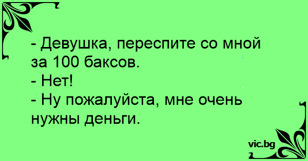 Влиза младеж в бара и с бързи стъпки се запътва към самотна девойка. Eine Mann zu einer Frau: "Würden Sie für 100 Euro mit mir schlafen?" Sagt die Frau: Nein, selbstverständlich nicht. Sagt der Mann: "Schade, ich hätte das Geld gut brauchen können."