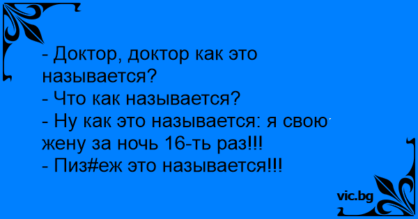 - Доктор, доктор как это называется? - Что как называется? - Ну как это называется: я свою жену за ночь 16-ть раз!!! - Пиз#еж это называется!!!