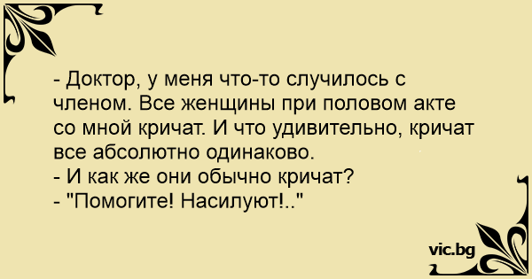 - Доктор, у меня что-то случилось с членом. Все женщины при половом акте со мной кричат. И что удивительно, кричат все абсолютно одинаково.