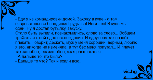 - Еду я из командировки домой. Захожу в купе - а там очаровательная блондинка.Грудь -во! Ноги - во! В купе мы одни. Ну я достал бутылку, закуску.