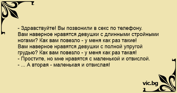 - Здравствуйте! Вы позвонили в cekc по телефону. Вам наверное нравятся девушки с длинными стройными ногами? Как вам повезло - у меня как раз такие! Вам наверное нравятся девушки с полной упругой грудью? Как вам повезло - у меня как раз такая! - Простите, но мне нравятся с маленькой и отвислой. - ... А вторая - маленькая и отвислая!