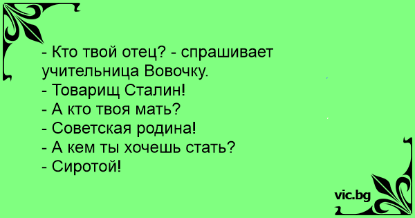 I den ryska skolan hade läraren förhör och frågade lille Ivan: - Vem är din fader? - Kamrat Brezjnev, svarade lille Ivan. - Och din moder? - Den ryska jorden. - Mycket bra, lille Ivan, och vad...