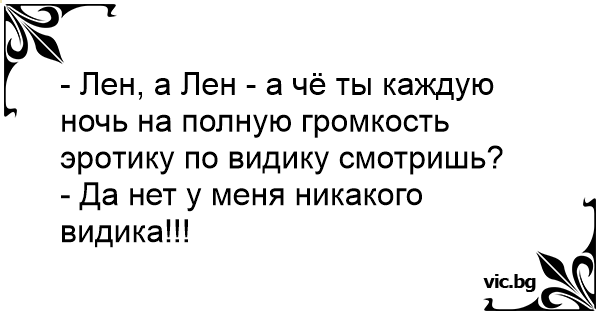 - Лен, а Лен - а чё ты каждую ночь на полную громкость эрoтику по видику смотришь?