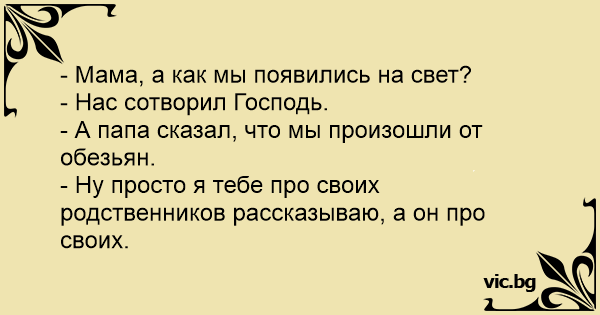 Дете ја прашува мајката: - Мамо како настанале луѓето? - Од мајмуни сине! После тоа детето оди кај татко си: - Тато како настанале луѓето? - Господ ги створил сине! - Ама мама вика дека се...