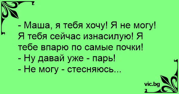 - Маша, я тебя хочу! Я не могу! Я тебя сейчас изнасилую! Я тебе впарю по самые почки!