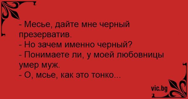- As dori un pachet de prezervative negre! - De ce tineti neaparat sa fie negre? - Merg la vaduva amicului meu sa ii transmit condoleantele mele.