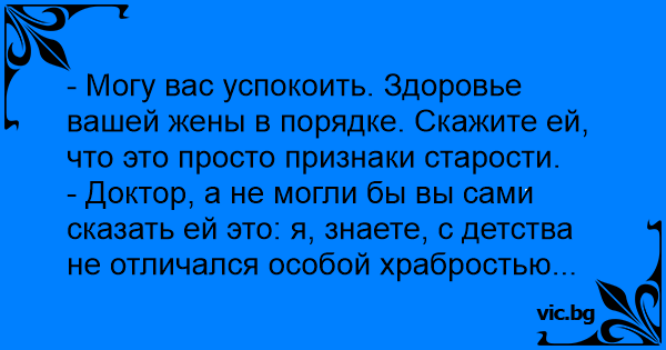 - Могу вас успокоить. Здоровье вашей жены в порядке. Скажите ей, что это просто признаки старости.