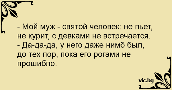 - Мой муж - святой человек: не пьет, не курит, с девками не встречается.