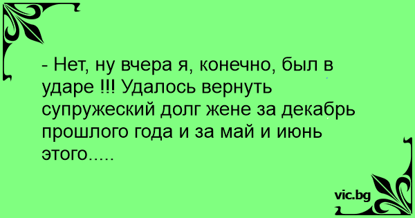 - Нет, ну вчера я, конечно, был в ударе !!! Удалось вернуть супружеский долг жене за декабрь прошлого года и за май и июнь этого.....