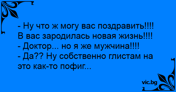 Ārsts pacientam: - Apsveicu, jūsu ķermenī ir uzradusies jauna dzīvība! - Dakter, nu ko jūs te gvelžat? Es taču esmu vīrietis! - Vispār jau cērmēm tas ir vienalga ...
