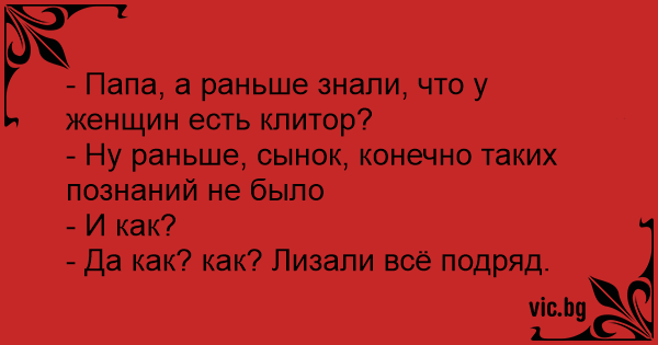 Син підходить до батька й запитує: — Тато, а раніше чоловіки знали, що в жінок є клітор? — Ні, синок, лизали всі підряд.