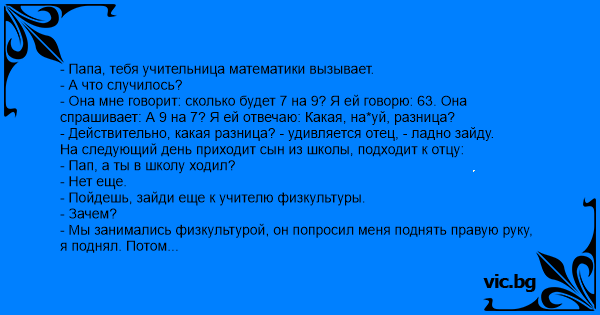 - Она мне говорит: сколько будет 7 на 9? Я ей говорю: 63. Она спрашивает: А 9 на 7? Я ей отвечаю: Какая, на*уй, разница?
