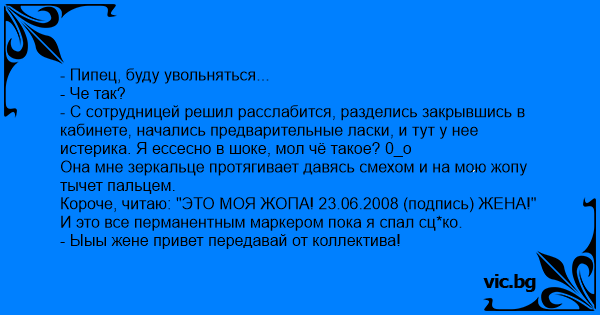 - С сотрудницей решил расслабится, разделись закрывшись в кабинете, начались предварительные ласки, и тут у нее истерика. Я ессесно в шоке, мол чё такое? 0_о