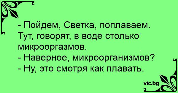 - Пойдем, Светка, поплаваем. Тут, говорят, в воде столько микрооргазмов.