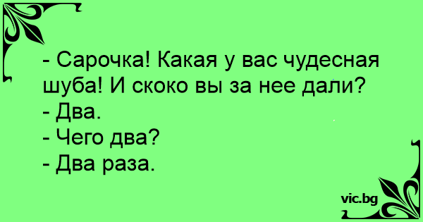 - Сарочка! Какая у вас чудесная шуба! И скоко вы за нее дали?