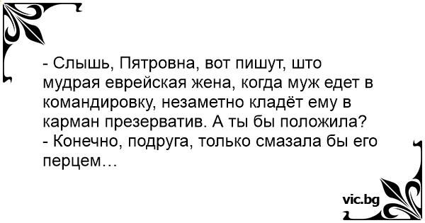 - Слышь, Пятровна, вот пишут, што мудрая еврейская жена, когда муж едет в командировку, незаметно кладёт ему в карман пpeзepbatиb. А ты бы положила?
