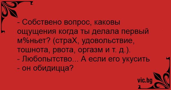 - Собствено вопрос, каковы ощущения когда ты делала первый м%ньет? (стpaX, удовольствие, тошнота, рвота, оргазм и т. д.).
