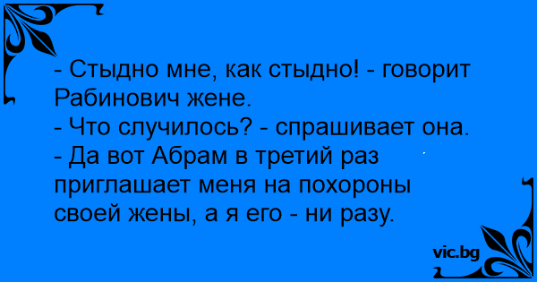 - Да вот Абрам в третий раз приглашает меня на похороны своей жены, а я его - ни разу.