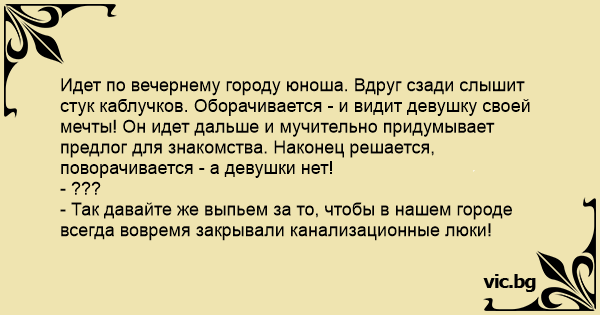 - Так давайте же выпьем за то, чтобы в нашем городе всегда вовремя закрывали канализационные люки!