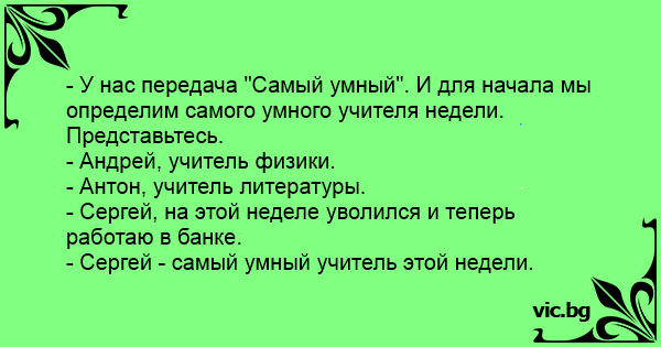 - У нас передача "Самый умный". И для начала мы определим самого умного учителя недели. Представьтесь.