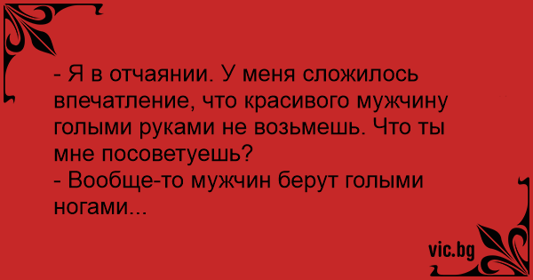 - Я в отчаянии. У меня сложилось впечатление, что красивого мужчину голыми руками не возьмешь. Что ты мне посоветуешь?