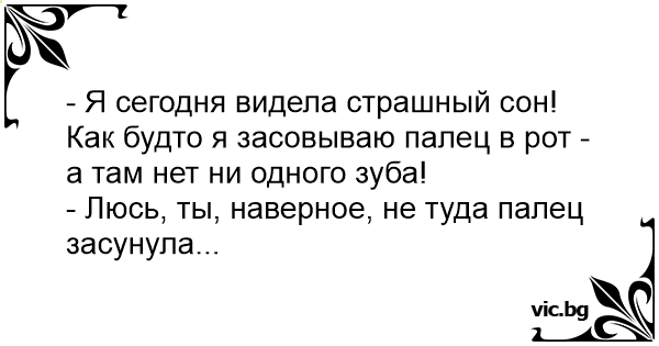 - Я сегодня видела страшный сон! Как будто я засовываю палец в рот - а там нет ни одного зуба!
