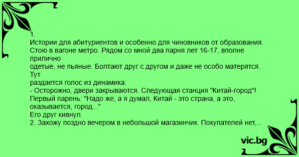 1. Истории для абитуриентов и особенно для чиновников от образования. Стою в вагоне метро. Рядом со мной два парня лет 16-17, вполне прилично одетые, не пьяные. Болтают друг с другом и даже не особо матерятся. Тут раздается голос из динамика: - Осторожно, двери закрываются. Следующая станция "Китай-город"! Первый парень: "Надо же, а я думал, Китай - это страна, а это, оказывается, город..." Его друг кивнул. 2. Захожу поздно вечером в небольшой магазинчик. Покупателей нет, две продавщицы лет двадцати разгадывают кроссворд. - Слышь, Мань, русский офицер, погибший при Бородино - Наполеон? Вторая подходит, считает клеточки в строке: - Ну да, правильно - Наполеон! Я выпала в осадок. Ну и кто после этого посмеет утверждать, что ЕГЭ как независимый экзамен не нужен, потому что в школе у нас чему-то учат?