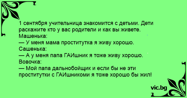 Bērni skolā stāsta, ar ko nodarbojas viņu vecāki. Jānītis: - Mans tētis ir ceļu policists, naudas mums ir daudz, dzīvojam labi! Anniņa: - Mana mamma ir prostitūta, naudas mums ir daudz, dzīvojam...