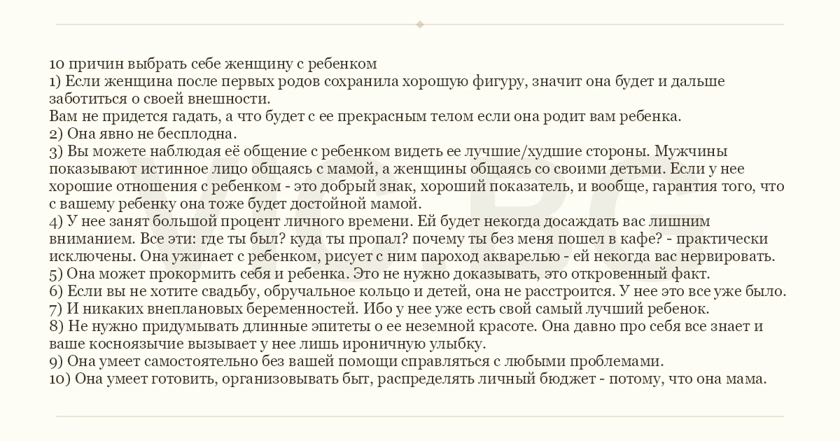 10 причин выбрать себе женщину с ребенком 1) Если женщина после первых родов сохранила хорошую фигуру, значит она будет и дальше заботиться о своей внешности. Вам не придется гадать, а что будет с ее прекрасным телом если она родит вам ребенка. 2) Она явно не бесплодна. 3) Вы можете наблюдая её общение с ребенком видеть ее лучшие/худшие стороны. Мужчины показывают истинное лицо общаясь с мамой, а женщины общаясь со своими детьми. Если у нее хорошие отношения с ребенком - это добрый знак, хороший показатель, и вообще, гарантия того, что с вашему ребенку она тоже будет достойной мамой. 4) У нее занят большой процент личного времени. Ей будет некогда досаждать вас лишним вниманием. Все эти: где ты был? куда ты пропал? почему ты без меня пошел в кафе? - практически исключены. Она ужинает с ребенком, рисует с ним пароход акварелью - ей некогда вас нервировать. 5) Она может прокормить себя и ребенка. Это не нужно доказывать, это откровенный факт. 6) Если вы не хотите свадьбу, обручальное кольцо и детей, она не расстроится. У нее это все уже было. 7) И никаких внеплановых беременностей. Ибо у нее уже есть свой самый лучший ребенок. 8) Не нужно придумывать длинные эпитеты о ее неземной красоте. Она давно про себя все знает и ваше косноязычие вызывает у нее лишь ироничную улыбку. 9) Она умеет самостоятельно без вашей помощи справляться с любыми проблемами. 10) Она умеет готовить, организовывать быт, распределять личный бюджет - потому, что она мама.