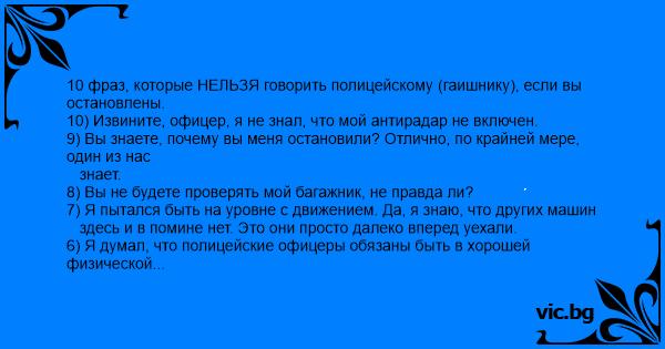 10 фраз, которые НЕЛЬЗЯ говорить полицейскому (гаишнику), если вы остановлены. 10) Извините, офицер, я не знал, что мой антирадар не включен. 9) Вы знаете, почему вы меня остановили? Отлично, по крайней мере, один из нас знает. 8) Вы не будете проверять мой багажник, не правда ли? 7) Я пытался быть на уровне с движением. Да, я знаю, что других машин здесь и в помине нет. Это они просто далеко вперед уехали. 6) Я думал, что полицейские офицеры обязаны быть в хорошей физической форме. 5) Офицер: Сынок, у тебя глаза красные. Ты пил алкоголь? Ваш ответ: Офицер, у вас глаза прозрачные. Вы пили воду? 4) Эй, вы, должно быть, ехали 180 км/час, чтобы угнаться за мной. Вот это молодец! 3) ілки-палки, офицер, какой класс! Прошлый раз я тоже отделался только предупреждением. 2) Это случайно не с вас они последний комикс в Мурзилке срисовали? 1) Я не могу достать права, если вы не подержите мое пиво. Перевод с английского Жени Эльгарта.