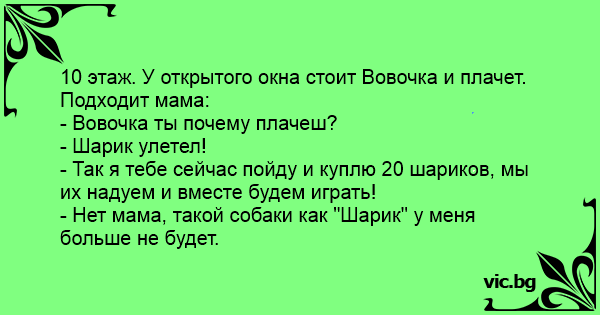 10 этаж. У открытого окна стоит Вовочка и плачет.