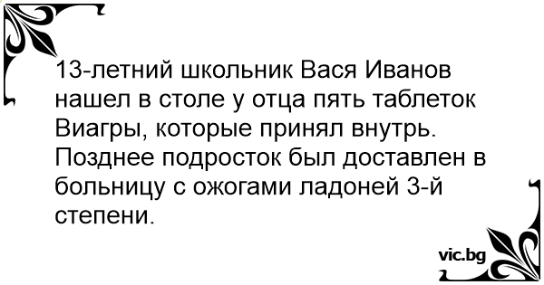 13-летний школьник Вася Иванов нашел в столе у отца пять таблеток Виагры, которые принял внутрь.