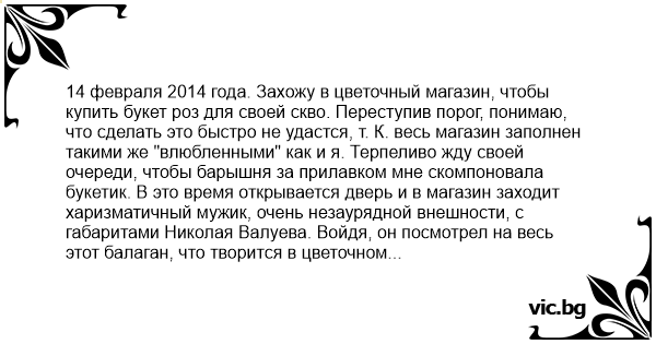 14 февраля 2014 года. Захожу в цветочный магазин, чтобы купить букет роз для своей скво. Переступив порог, понимаю, что сделать это быстро не удастся, т. К. весь магазин заполнен такими же "влюбленными" как и я. Терпеливо жду своей очереди, чтобы барышня за прилавком мне скомпоновала букетик. В это время открывается дверь и в магазин заходит харизматичный мужик, очень незаурядной внешности, с габаритами Николая Валуева. Войдя, он посмотрел на весь этот балаган, что творится в цветочном салоне, и выдал только одну фразу, после которой лёг весь магазин: