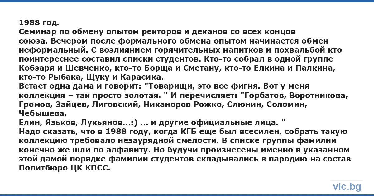 1988 год. Семинар по обмену опытом ректоров и деканов со всех концов союза. Вечером после формального обмена опытом начинается обмен неформальный. С возлиянием горячительных напитков и похвальбой кто поинтереснее составил списки студентов. Кто-то собрал в одной группе Кобзаря и Шевченко, кто-то Борща и Сметану, кто-то Елкина и Палкина, кто-то Рыбака, Щуку и Карасика. Встает одна дама и говорит: "Товарищи, это все фигня. Вот у меня коллекция – так просто золотая. " И перечисляет: "Горбатов, Воротникова, Громов, Зайцев, Лиговский, Никаноров Рожко, Слюнин, Соломин, Чебышева, Елин, Язьков, Лукьянов...:) ... и другие официальные лица. " Надо сказать, что в 1988 году, когда КГБ еще был всесилен, собрать такую коллекцию требовало незаурядной смелости. В списке группы фамилии конечно же шли по алфавиту. Но будучи произнесены именно в указанном этой дамой порядке фамилии студентов складывались в пародию на состав Политбюро ЦК КПСС.