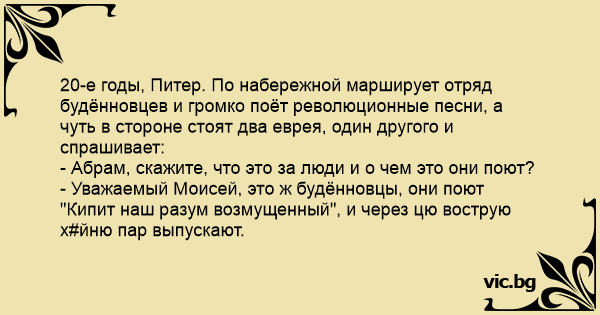 20-е годы, Питер. По набережной марширует отряд будённовцев и громко поёт революционные песни, а чуть в стороне стоят два еврея, один другого и спрашивает: