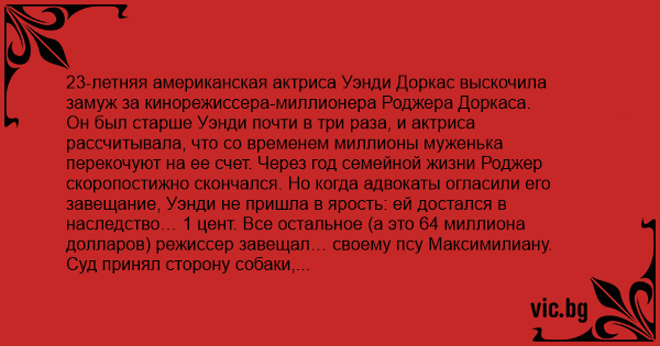 Он был старше Уэнди почти в три раза, и актриса рассчитывала, что со временем миллионы муженька перекочуют на ее счет. Через год семейной жизни Роджер скоропостижно скончался. Но когда адвокаты огласили его завещание, Уэнди не пришла в ярость: ей достался в наследство… 1 цент. Все остальное (а это 64 миллиона долларов) режиссер завещал… своему псу Максимилиану.